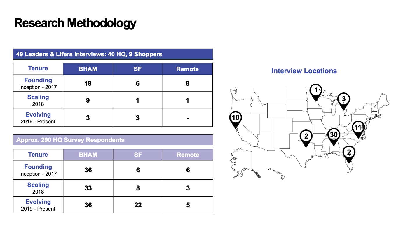 Our five-person team designed and executed a mixed-methods research program, heavily qualitative but supported by survey data from roughly 290 HQ respondents. I conducted many of the one-on-one interviews with leaders and long-tenure employees ("Lifers") across Birmingham, San Francisco, and remote locations, and was a key contributor to synthesis and content creation. We segmented respondents by era: Founding (to 2017), Scaling (2018), and Evolving (2019+), which let us see how the company's identity had shifted as it grew.
